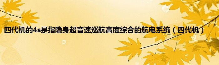 大家好,小问来为大家解答以上问题。四代机的4s是指隐身超音速巡航高度综合的航电系统,四代机这个很多人还不知道,现在让我们一起来看看吧!