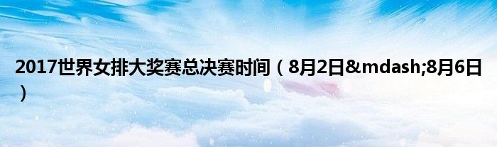 一、问:2017世界女排大奖赛总决赛时间?:答:2017世界女排大奖赛总决赛时间:8月2日—8月6日,地点在南京奥林匹克体育中心。
