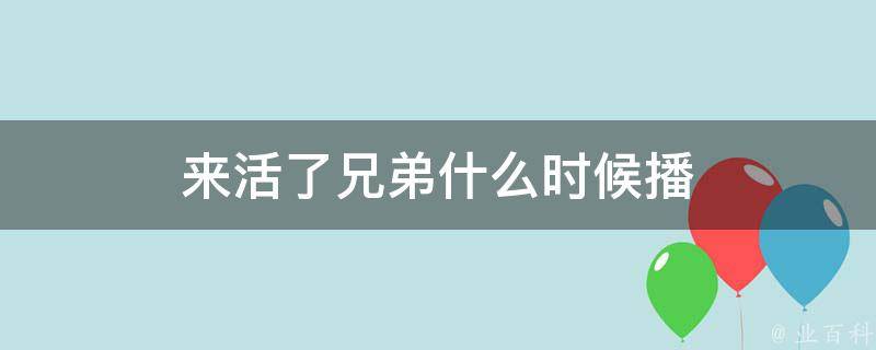 来活了兄弟播出时间是2023年5月9日。《来活了兄弟》是由爱奇艺推出的融创旅行体验真人秀,节目于2023年5月9日20:00在爱奇艺首播,2023年5月12日起每周五21:20在江苏卫视播出;第二期起改档为每周二12:00在爱奇艺播出。