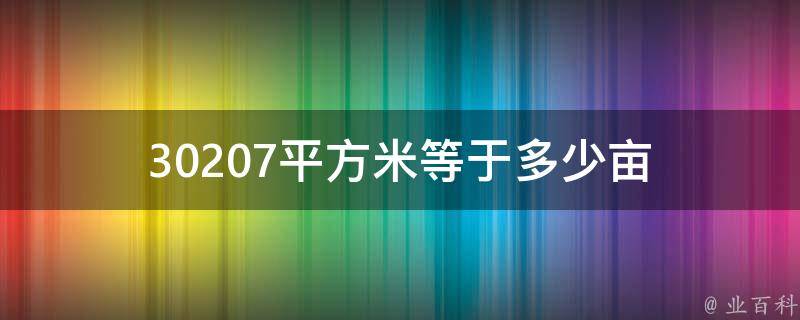 30207平方米等于45.3105亩。1平方米=0.0015亩。平方米是面积的公制单位,定义为边长为1米的正方形的面积。在生活中平方米通常简称为平米或平方。港台地区则称为平方公尺。