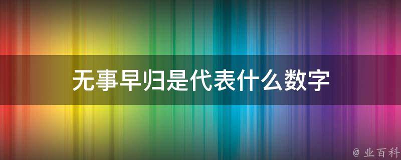 最佳答案无事早归是代表数字0。因为归是回归的意思,而任何事情都是从零开始的,所以,无事早归是代表数字0。在数字谐音中,0代表圆满、完美、无尽;1代表唯一、你、起点;2代表爱、两人世界;3代表想念、生命、生活。