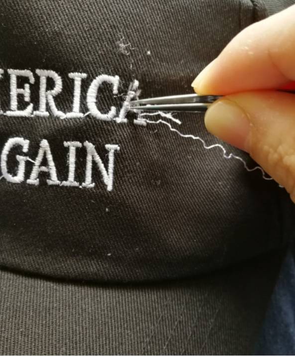 2、用镊子在正面将绣线拔除。期间可以用剪刀将拔出的部分线头剪去,避免遮挡操作。