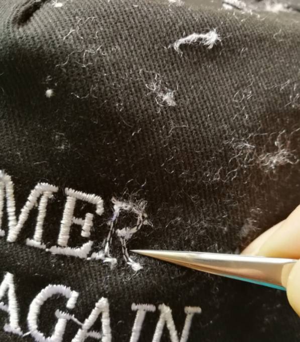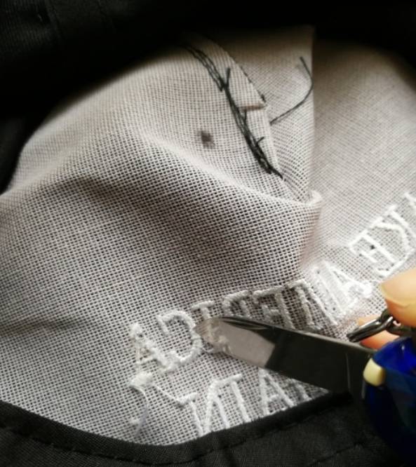 1、用较锋利的小刀在绣字或图案的背面沿字在中间划开。注意不要把底布划烂,把线划开即可。