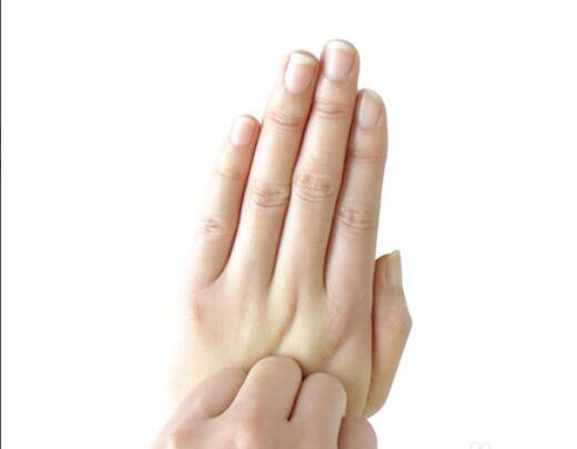 3、找到左手的大拇指和食指间陷进去的部位,用右手旋转揉捏,两手交替动作各30秒。