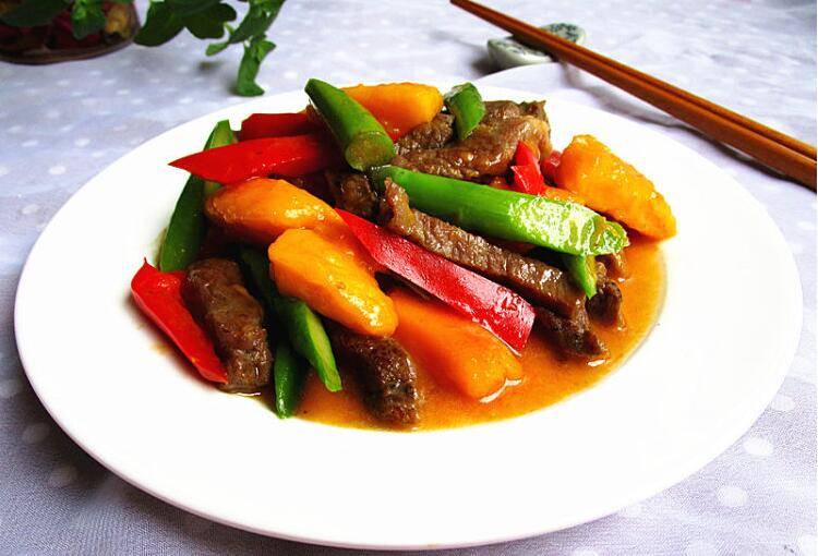 1、食材准备:牛排150克、芒果200克、芦笋2根、橄榄油、盐、彩椒、水淀粉各适量。