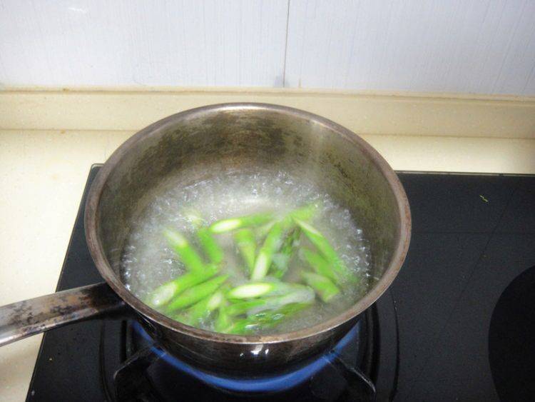 4、先把芦笋用沸水焯烫变色后捞起。
