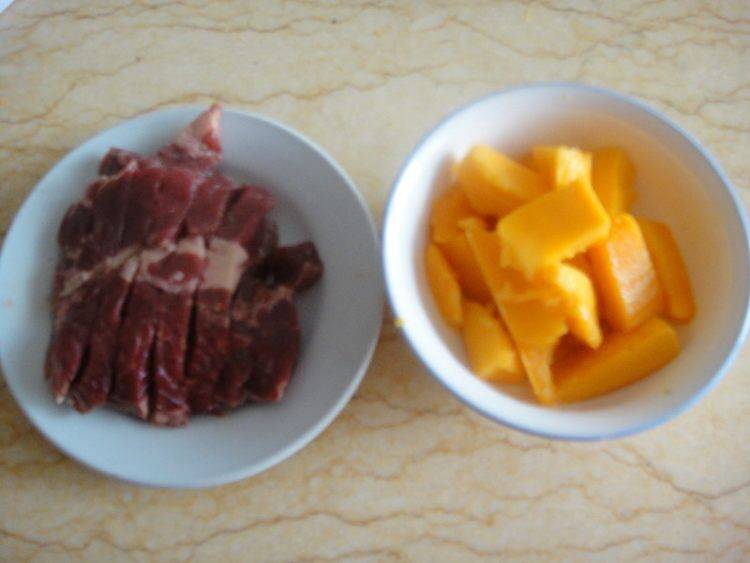 3、牛排切条,芒果去皮切块。