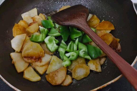 3、加入少许米醋,土豆片炒到基本熟了时,倒入青椒块。