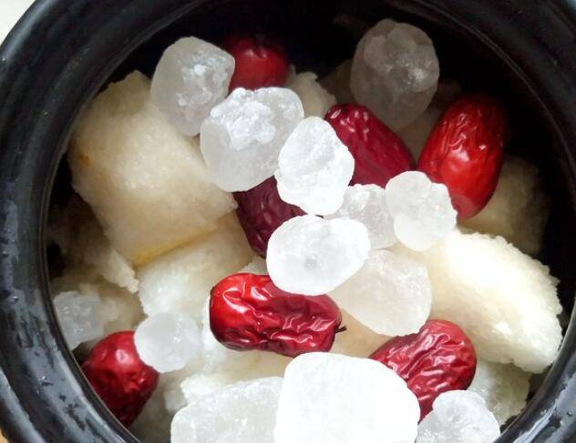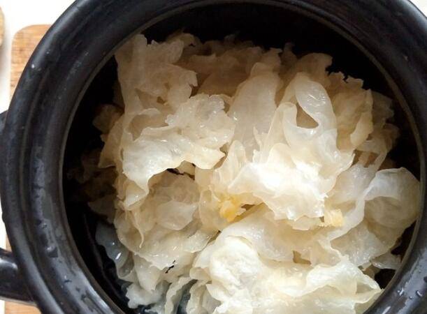 3、把梨块和银耳放入砂锅中。