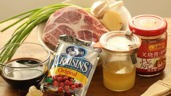 用料:梅花肉300g、葱1把、姜3片、蒜1瓣、蔓越莓干200g、水、红烧汁2大勺、叉烧酱1/3瓶、白酒少许、蜂蜜适量、冰糖2块。