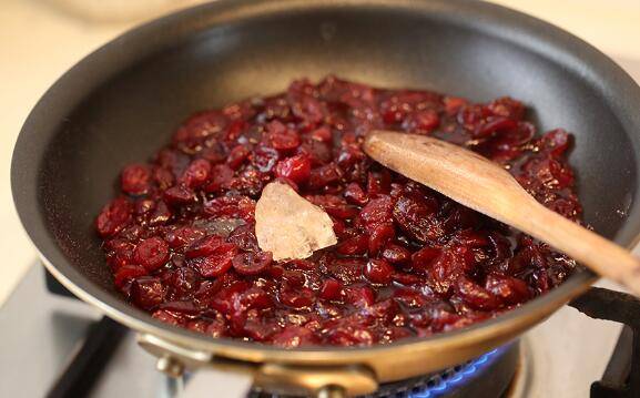 1、蔓越莓干提前一晚加水浸泡,第二天放锅内加冰糖煮开后用搅拌机打成酱。