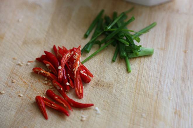 3、小米辣切斜段,韭黄切段,生姜、大蒜切块。
