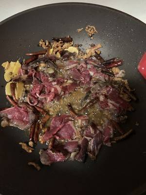 用料:牛干巴适量、蒜苗叶2根、干辣椒适量、花椒粒适量、姜片适量、料酒、鸡精。