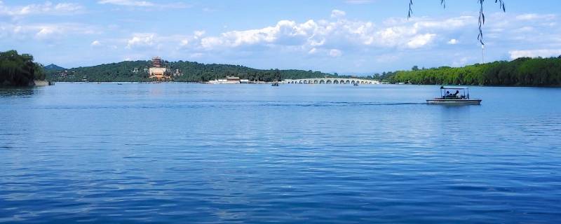 北京颐和园。昆明湖,古称七里泊、瓮山泊、大泊湖、西湖。北京市海淀区颐和园内湖泊,属海河流域北运河支流通惠河水系。古代源于玉泉山诸水,1966年京密引水渠建成后,水源多来自此渠。出水为南长河。昆明湖的面积约为颐和园总体面积的四分之三,总面积有3000亩之阔。元代始为通州漕运的水源地,金代以后逐步建设皇家园林,至清代形成规模宏大的颐和园。民国以后,成为公园。