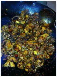 起锅烧油,加入花椒、辣椒、草果、麻辣酱、桂皮、大蒜、大葱,爆出香味后加入竹鼠翻炒均匀;