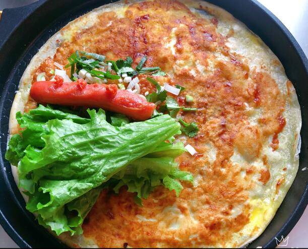 4、翻面,刷上酱料,放入薄脆饼、肠、生菜、葱花、香菜等配菜即可。