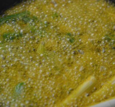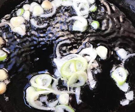 3、热锅放油,放大葱、生姜爆香。