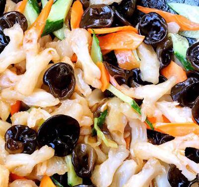 1、准备食材:猪蹄筋300克、胡萝卜50克、黄瓜50克、木耳50克、葱10克、蒜10克、酱油1匙、蚝油1匙、糖0.5匙、盐0.5匙、味精0.2匙。