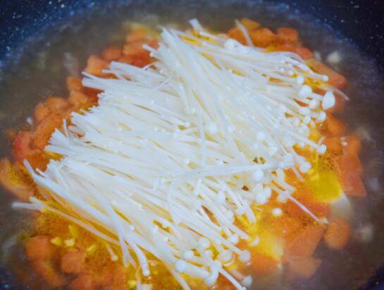 5、再次烧开,放入金针菇。
