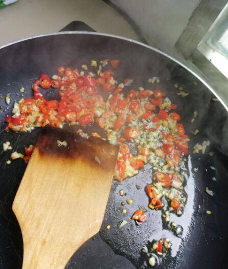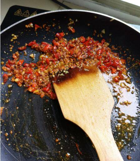 2、锅内下少许油,油烫后下入姜蒜辣椒面爆香。