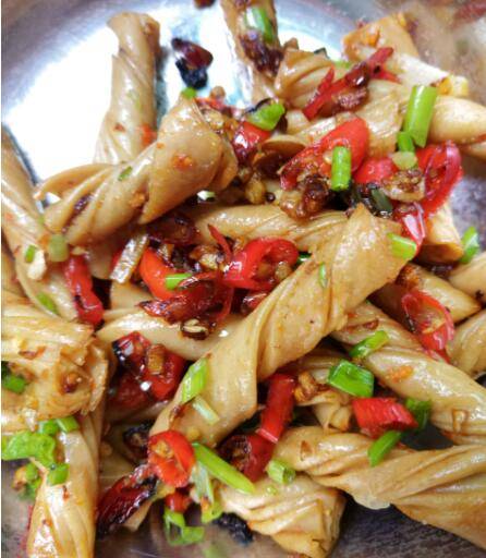 4、倒入准备好的豆棒,加入盐鸡精,香油和耗油翻拌,关火,再加入葱末翻拌好等冷却后就可以装盘。