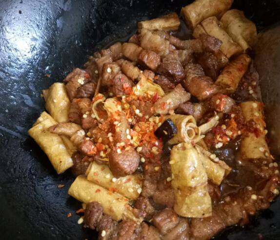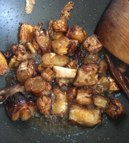 6、倒入生抽调味,少许老抽上色,一点冰糖提味,继续翻炒。然后加热水炖煮约2个小时直到牛蹄筋软烂。家里如果有高压锅可以用高压锅炖。