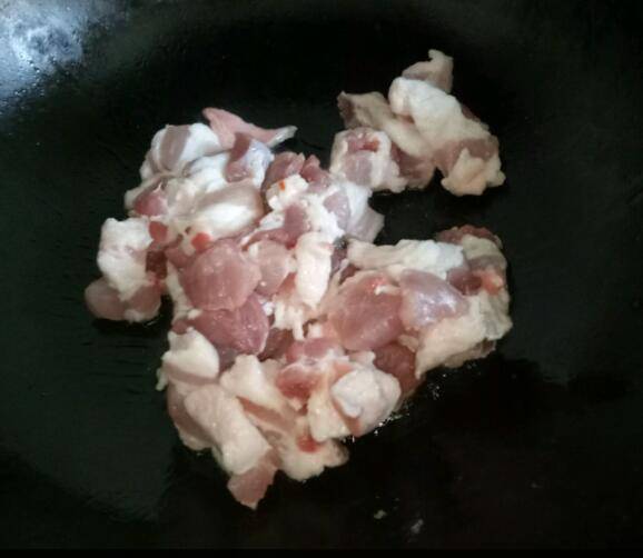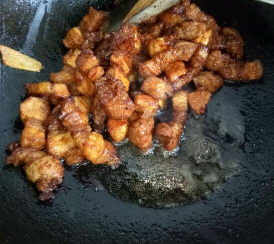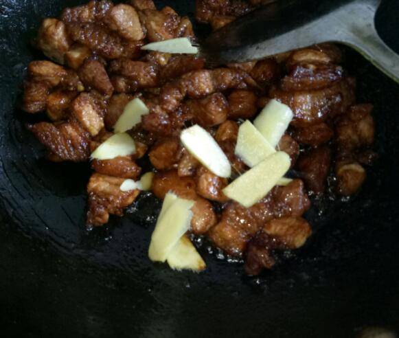 4、锅内放油,放入五花肉,放料酒,老抽,生抽,姜片翻炒。