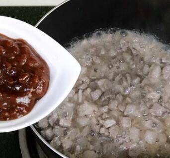 3、锅中倒油,下肉末炒熟,加入黄豆酱、料酒、糖、大葱翻拌均匀。