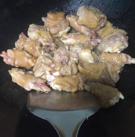3、红萝卜切块,炒锅里放少许油,放冰糖,小火熬出糖色,放鸭翅根翻炒至均匀上去糖色。