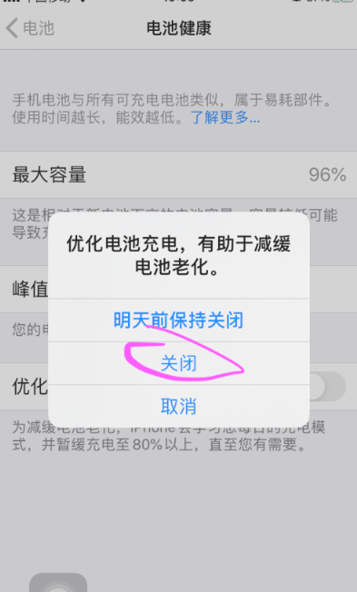 关闭优化电池充电功能,iPhone手机将不会学习记录每天得充电模式,手机充电将充到100%为止。