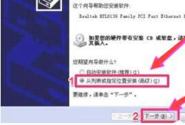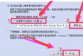 在下一窗口中,选择“在搜索中包括这个位置”,然后点击“浏览”,加载网卡驱动,然后点击“下一步”,向导就会开始安装网卡的驱动程序。