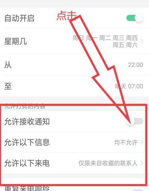 5、点击开启“允许接受通知选项”,对允许接受的信息、来电进行设置,即可完成免打扰设置。