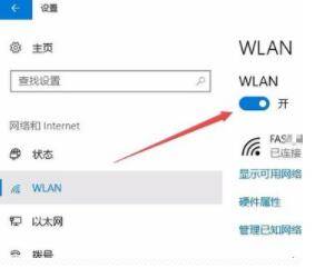 4、然后在右侧窗口中,可以看到一项为Wlan的设置,把其开关设置为开或关,即可实现打开或关闭无线网络的功能。