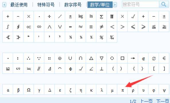 第三步:点击后会弹出一个符号集成框。点击“π”即可。