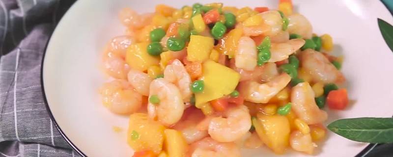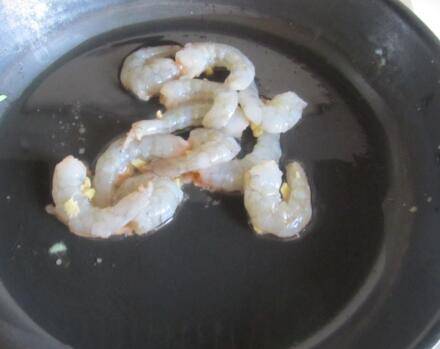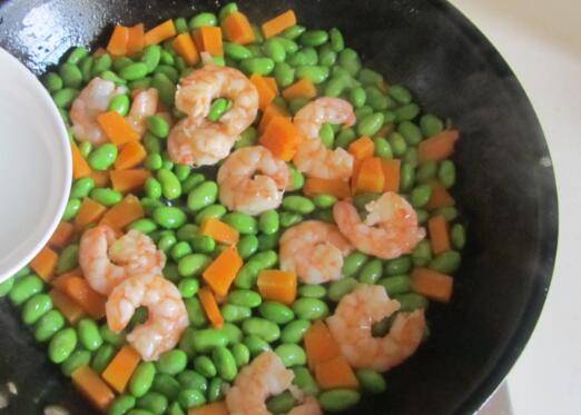 热锅凉油,放入虾仁进去翻炒;翻炒几下后加入焯好的豆米和南瓜丁。