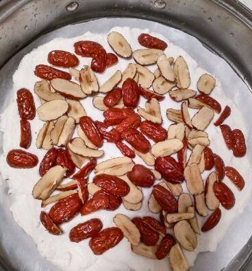 4、把糯米粉均匀铺一层,然后铺一层红枣。记得边上留空隙,比较好熟。