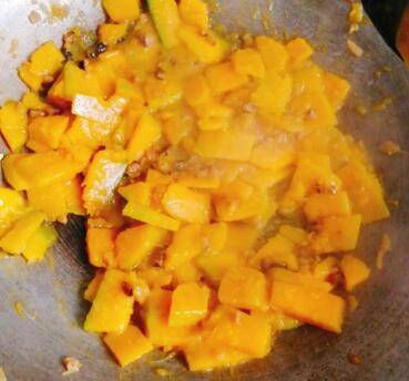 倒入南瓜翻炒均匀,炒到熟透,加盐味精耗油胡椒粉调味,倒入猪肉翻炒。