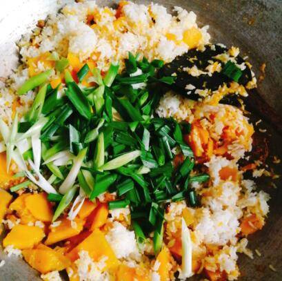 加米饭,下蒜段,翻炒均匀就可以关火。