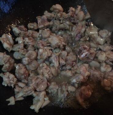 牛蛙切成小块,加入料酒、白醋、食盐腌制十分钟,锅内放油烧至八成熟,倒入牛蛙爆炒脱生。