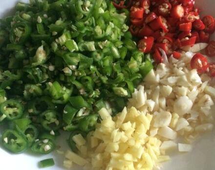 青红椒、老姜、大蒜子切碎,紫苏切末备用。