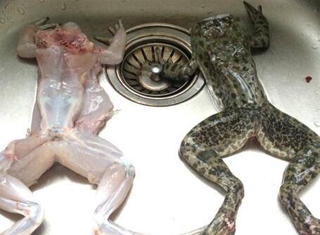 将牛蛙用水冲洗干净,剖开掏出内脏,然后剥皮,再用流水冲洗干净,放到碗中沥水。