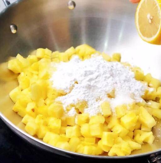 2、炒锅中倒入浸泡好的菠萝丁,再加入120克糖、20克淀粉和柠檬汁10克。