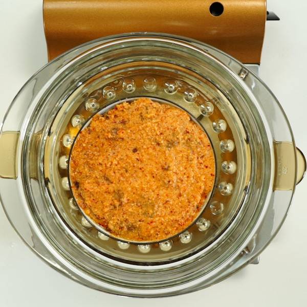 3、再放入五香蒸肉粉、水,搅拌均匀,腌制15分钟。
