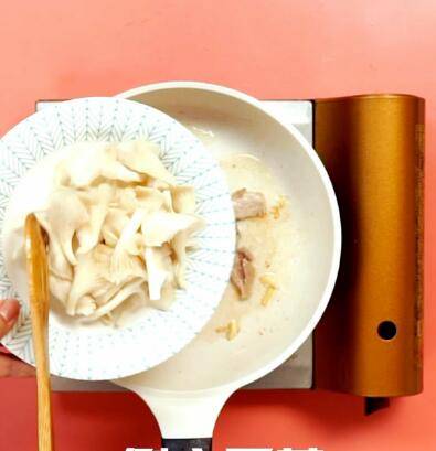 锅中放油加肉片,姜蒜,炒至变色加平菇。
