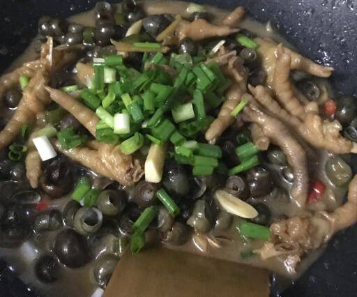 鸡爪先下锅翻炒两分钟,螺丝下锅跟鸡爪一起翻炒,加料酒翻炒,依次放入生姜大蒜辣椒接着翻炒。生抽,酱油,醋放入翻炒,待鸡爪变色加入盐鸡精加水炖5分钟。