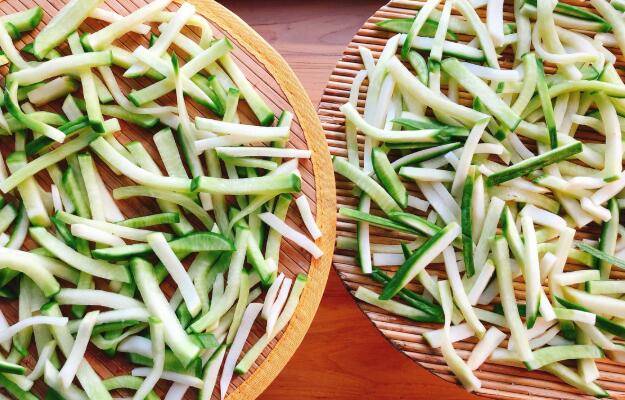 晾晒四天左右即可装入袋中,需要食用时用开水烫一下。