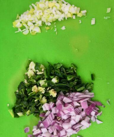 准备葱姜蒜切碎,青椒、洋葱切丁备用。