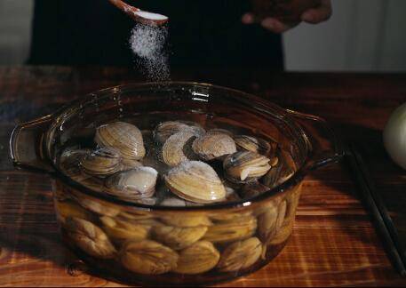 黄蚬子买回后,清水洗净,放两勺盐并用清水浸泡1小时以上,让蚬子吐净泥沙。