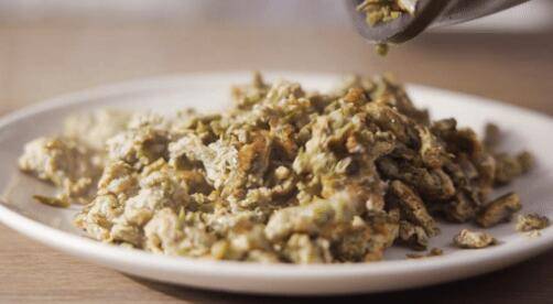 4、香椿控水后,去掉根部,切碎后放入碗中。