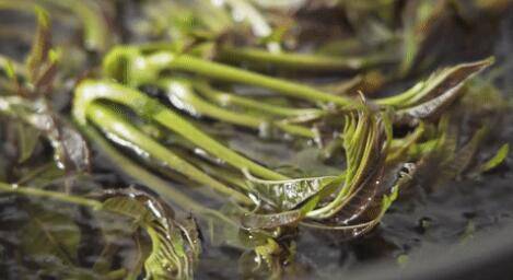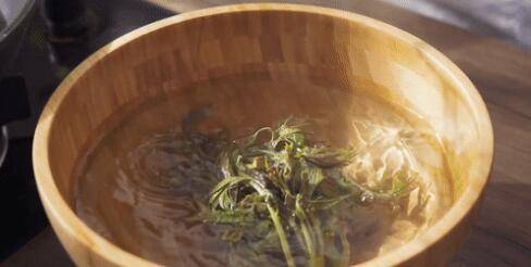 2、入锅后香椿会立刻变成翠绿的颜色,焯水20秒左右即可捞出。